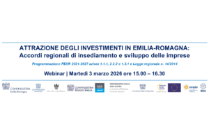 Il webinar, che inizierà alle ore 15.00, è dedicato ad approfondire contenuti, requisiti e modalità operative del bando regionale “Attrazione degli investimenti in Emilia-Romagna – Accordi regionali di insediamento e sviluppo delle imprese” previsto dal PR FESR Emilia‑Romagna 2021–2027, finalizzato a sostenere programmi di investimento strategici ad alto impatto tecnologico, occupazionale e industriale.