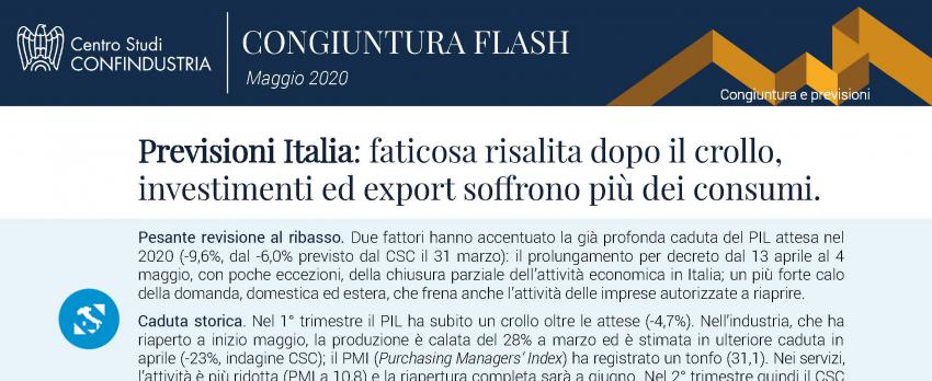 Previsioni per l’Italia nel 2020-2021: una faticosa risalita dopo il crollo, con gli investimenti e l’export che soffrono più dei consumi.