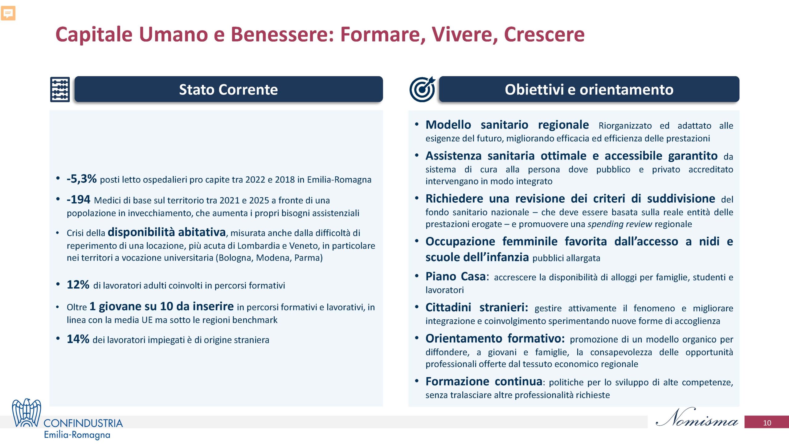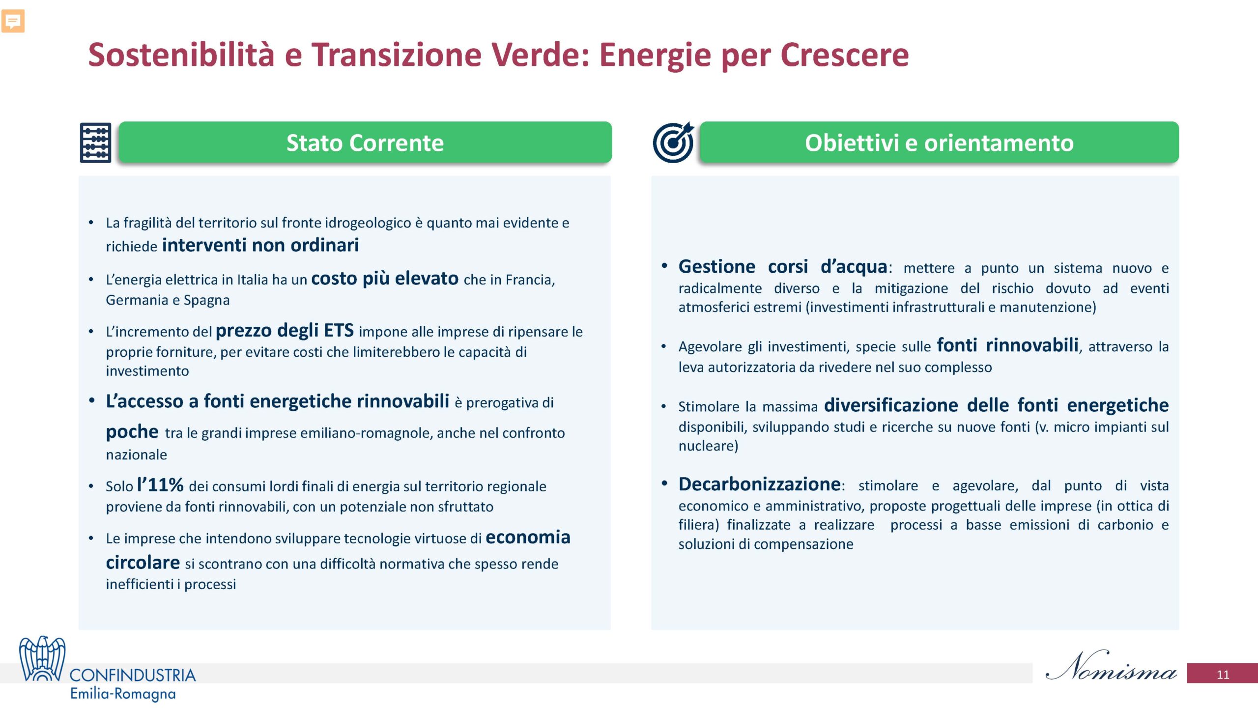 Gli imprenditori di Confindustria Emilia-Romagna hanno realizzato l’analisi “Sfide e priorità per il futuro dell’Emilia-Romagna”, che ha individuato i dieci macro-temi Innovazione, Sostenibilità, Sanità e welfare, Abitare, Capitale umano, Semplificazione, Logistica e trasporti, Filiere e internazionalizzazione, Transizione energetica, Infrastrutture, declinati in quattro percorsi di sviluppo: