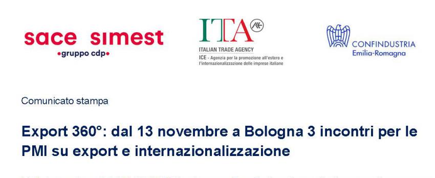 Incontri in aula, colloqui individuali e webinar in tre giornate di full immersion di export e internazionalizzazione per le PMI italiane. È questo il programma del progetto EXPORT 360° che il 13, 14 novembre e 13 dicembre offrirà gratuitamente una formazione specialistica con esperti ICE e SACE SIMEST su commercio e investimenti sui mercati esteri. L’iniziativa nasce dalla partnership tra ICE-Agenzia e SACE SIMEST, in collaborazione con i partner Confindustria Emilia-Romagna e Confindustria Emilia Area Centro.