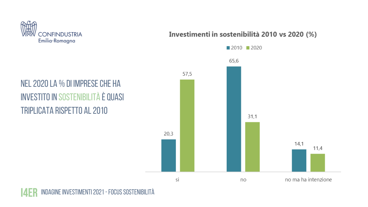 Il focus sulla sostenibilità − che si avvale anche di un commento da parte di Prometeia − dimostra come lo sviluppo sostenibile sia ormai pienamente inserito nelle strategie delle imprese. Se nel 2010 era quasi identica la percentuale di imprese che dichiarava di avere intrapreso volontariamente una politica sostenibile e di quelle che lo facevano per adeguarsi alla normativa vigente, ora le aziende che lo fanno in modo volontario sono il doppio delle altre.