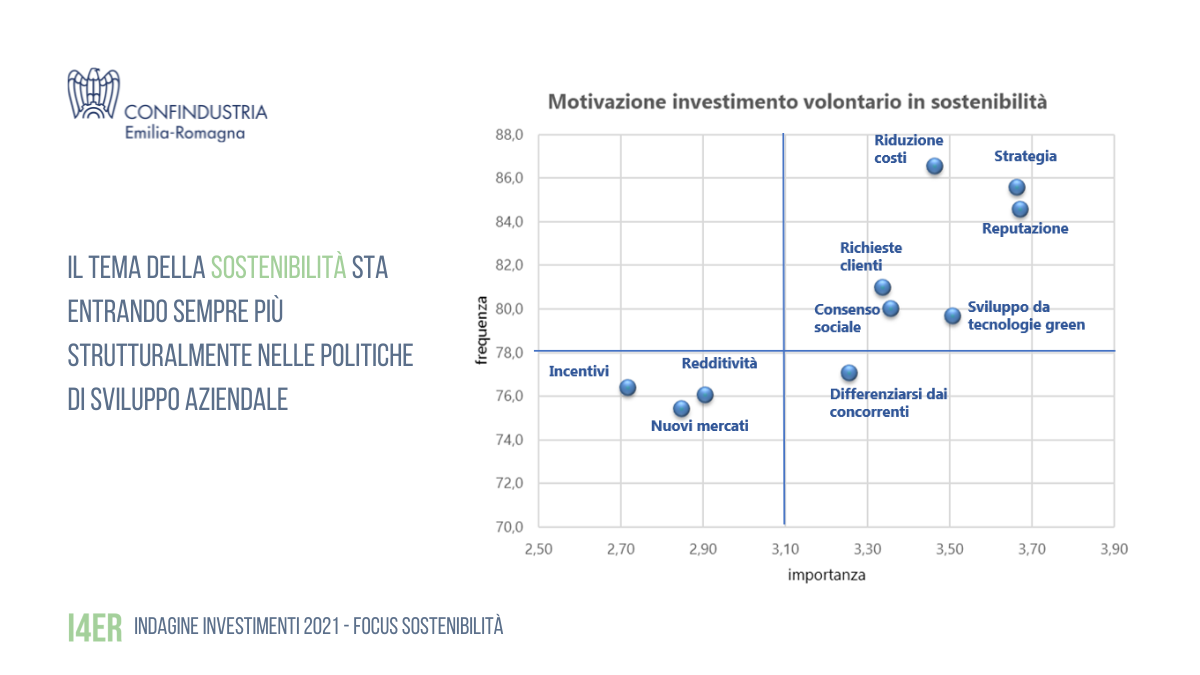 Le motivazioni economiche ad investire in sostenibilità evidenziano come il tema stia diventando sempre più rilevante nelle politiche di sviluppo aziendale: i fattori che riscontrano la maggior frequenza di risposte sono rilevanza strategica, riduzione dei costi e miglioramento della reputazione verso i clienti e i fornitori. Oggi ha acquisito grande importanza anche la ricerca di consenso sociale, considerata dieci anni fa scarsamente rilevante.
