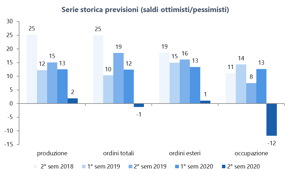 Il 32,1% delle imprese (dati rilevati prima dell’estate) ha aspettative di miglioramento per la seconda metà dell’anno, il 37,7% ritiene che il contesto rimarrà stazionario e continuerà ad essere caratterizzato da dinamiche difficili per produzione e ordini; il restante 30,2% si aspetta un peggioramento ulteriore della situazione economica. Saldi fra ottimisti e pessimisti, solitamente su valori positivi di 10-15 punti, sono nulli o negativi per produzione, ordini e occupazione.