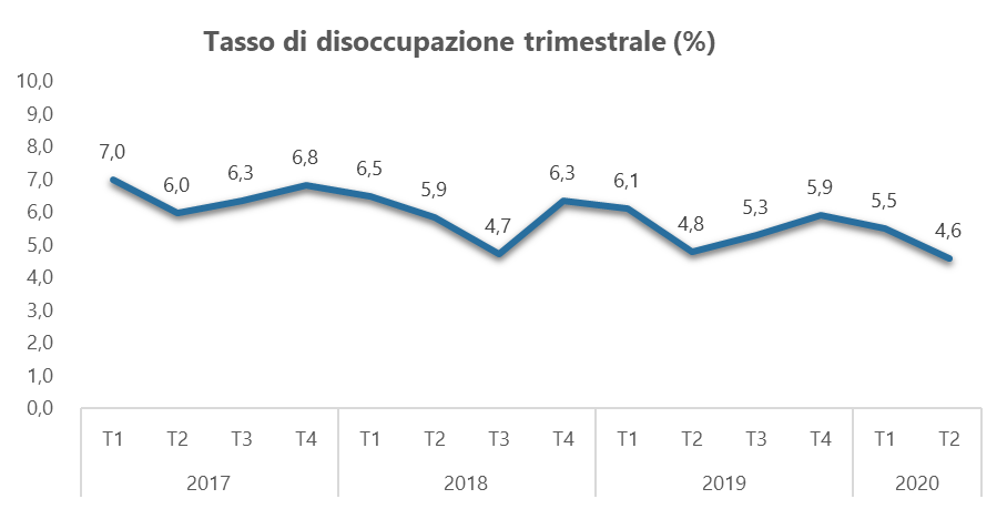 Nel 2° trimestre 2020 l’occupazione in regione ha subito un calo pari a -69 mila occupati, scendendo a 1.988 mila (rispetto al 2° trimestre 2019). Il tasso di disoccupazione si attesta al 4,6% (media italiana 7,7%), il tasso di occupazione al 68,7% (media italiana 57,5%).
