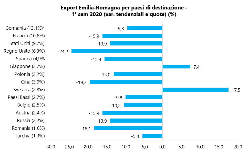 Export regionale -14,2% nel 1° semestre 2020, media Italia – 15,3% – Nel periodo gennaio-giugno 2020 l’Emilia-Romagna ha esportato beni e servizi per 28.352 milioni di euro, 4,7 miliardi in meno rispetto allo stesso periodo dell’anno precedente (-14,2%). Con una quota del 14,1%, l’Emilia-Romagna conferma e rafforza la seconda posizione per peso sull’export nazionale alle spalle della Lombardia.