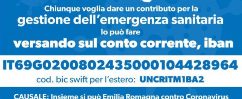 La Regione Emilia-Romagna ha lanciato una raccolta fondi per la gestione dell’emergenza sanitaria legata al Coronavirus collegata al conto corrente della Protezione civile regionale dell’Emilia-Romagna: