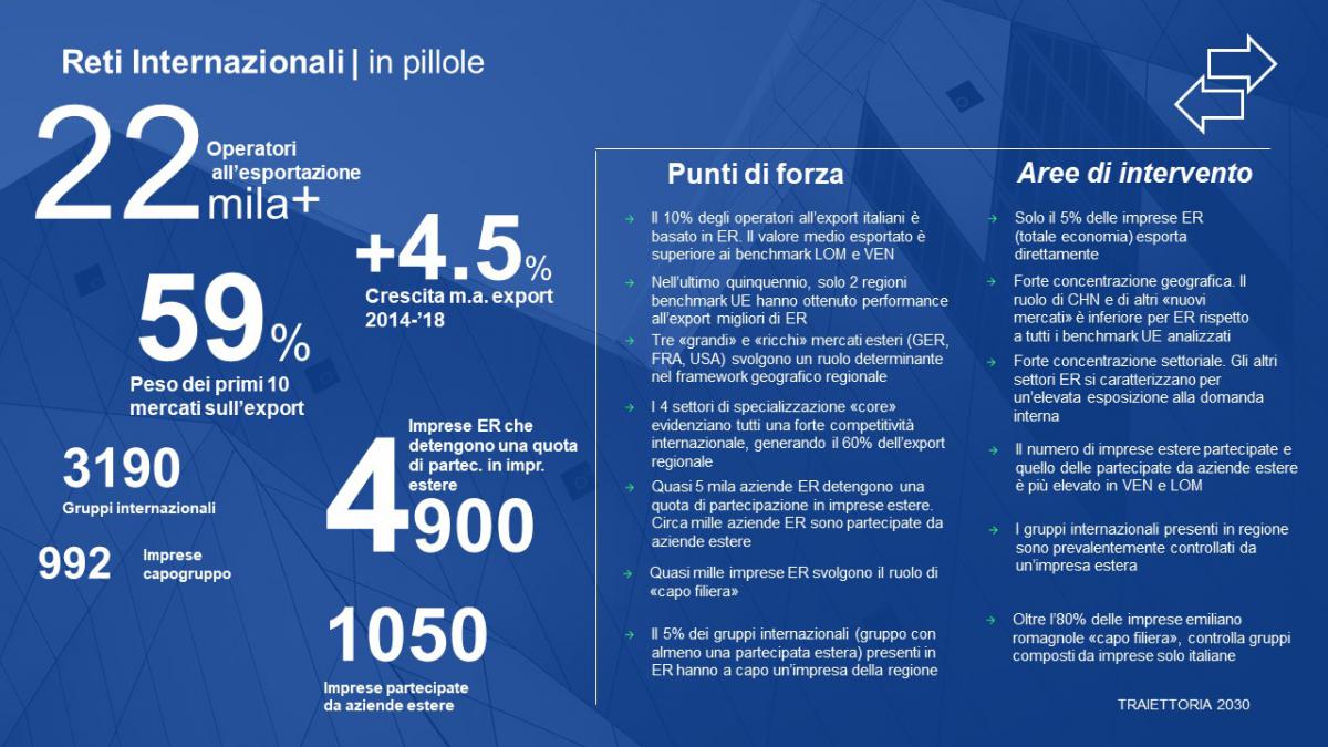 - Il 10% degli operatori italiani all’export è in Emilia-Romagna. Il valore medio esportato è superiore ai benchmark Lombardia e Veneto.
