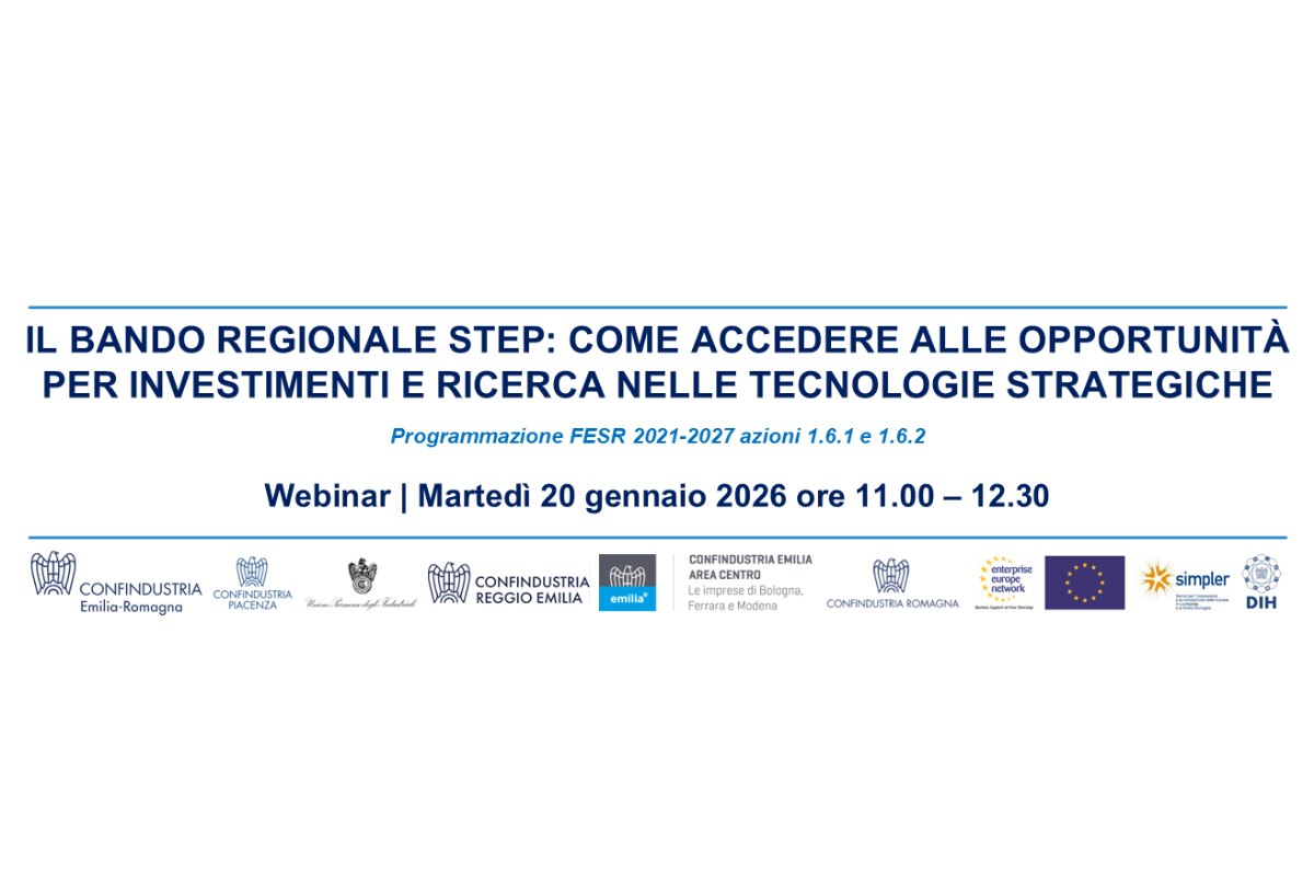 Il 20 gennaio 2026 Confindustria Emilia-Romagna organizza, con inizio alle ore 11.00, il webinar “Il bando regionale STEP: come accedere alle opportunità per investimenti e ricerca nelle tecnologie strategiche”.